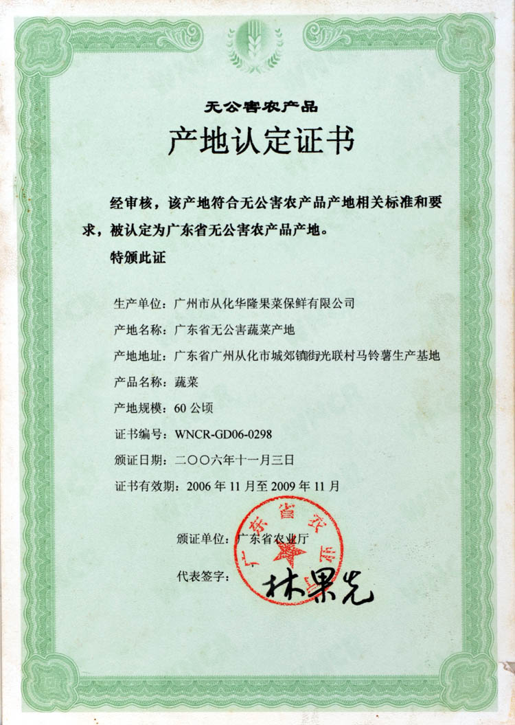 无公害农产品产地认定证书