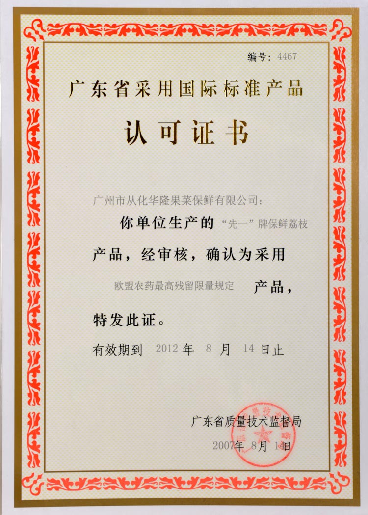 广东省采用国际标准产品认可证书