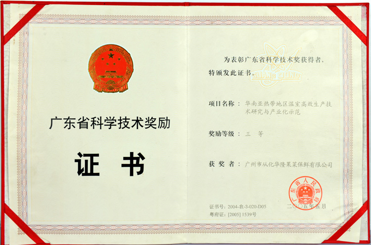 广东省科学技术奖励证书