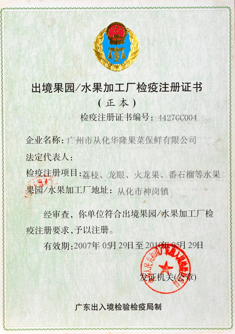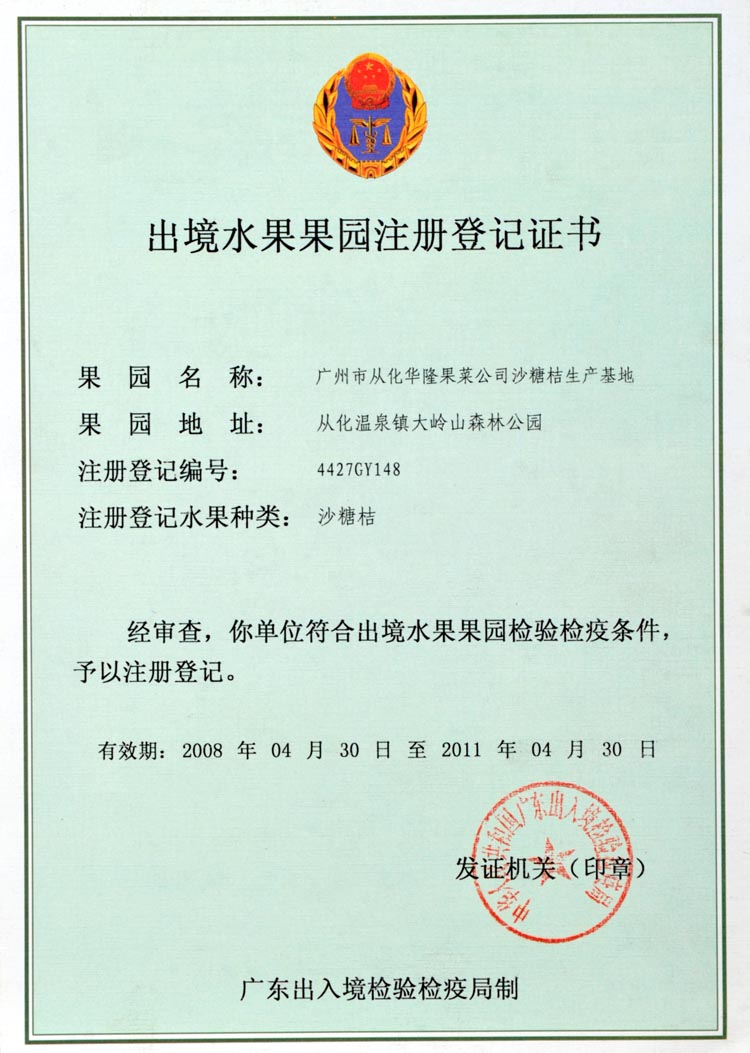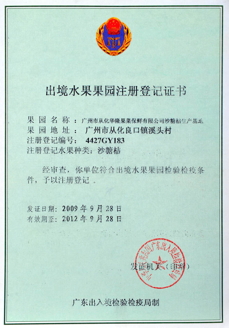 出境果园/水果加工厂检疫注册证书