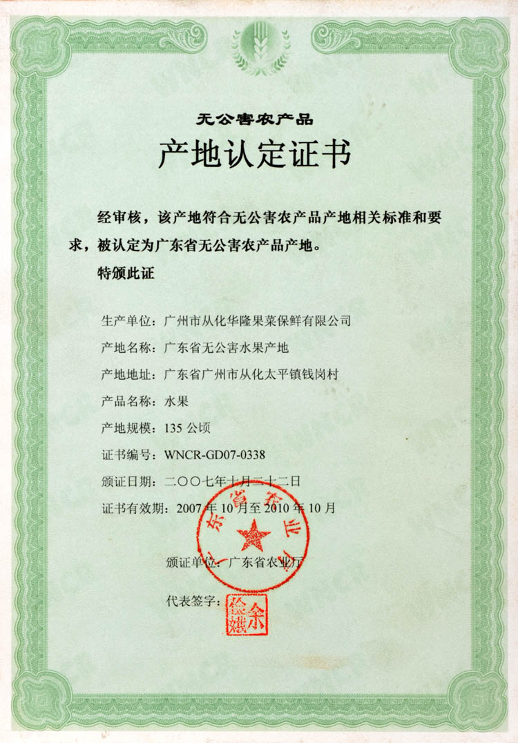 无公害农产品产地认定证书